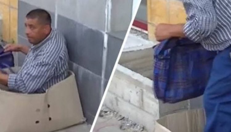 На відео видно, як чоловік у коробці, вдаючи, що у нього не має ніг, просив милостиню у перехожих.