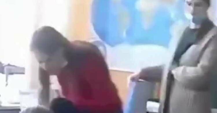 Учитель підвищувала голос на школяра, питаючи – де він сидить, а потім притиснула боком до парти, тримаючи за передпліччя, схилилася над ним і продовжувала відчитувати.