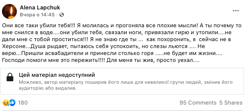 “Вони вбили тебе, зв’язали ноги, прив’язали гирю і втопили… Не дали мені з тобою попрощатися!”- пише дружина.